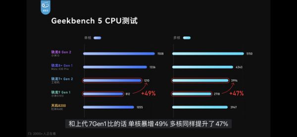 从UP主极客湾的实际测试情况来看,在Geekbench 5的测试之下,骁龙7+ Gen 2 这颗处理器的单核心跑分达到了1210,多核心成绩则为3994。与自己上一代的骁龙7 Gen 1相比,单核性能提升了49%,多核性能则提升了47%。与竞品联发科天玑8200相比,整体成绩相当接近。