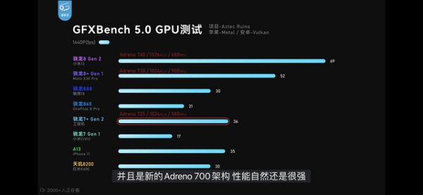 GPU部分表现自然是接近旗舰芯片的水准,同样是基于目前极客湾的实际测试。在GFXBench 5.0的软件测试之下,骁龙7+ Gen 2的分数达到了36 FPS的水准。性能接近苹果的A13,更是远超自家的骁龙888,竞品天玑8200更是不在话下。