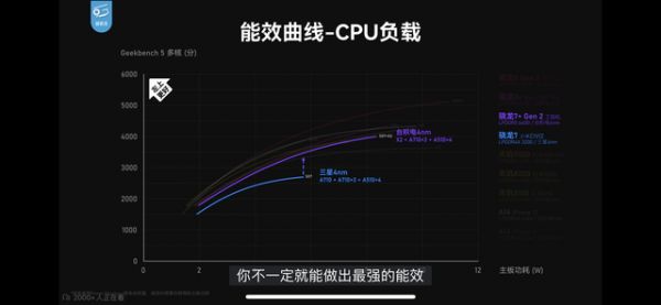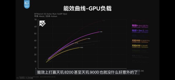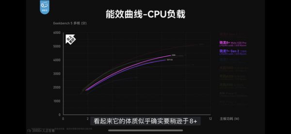 另外在能耗比这一块,大家也不用担心这颗处理器会出现上一代大翻特翻的情况。整体表现和高通骁龙8+非常接近,尤其是在中低频的情况之下,而到了峰值性能这一块,则会稍稍落后于骁龙8+。鉴于目前还是工程机的情况,可以看看后续量产机的实际表现。