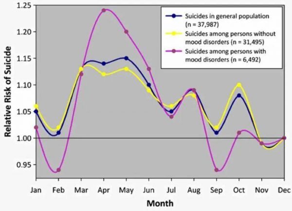 值得注意的是:虽然各项研究数据不一,但整体趋势表明:心境障碍(如抑郁、躁狂、双相情感障碍等)患者的自杀风险受季节影响的程度远高于未患病群体。