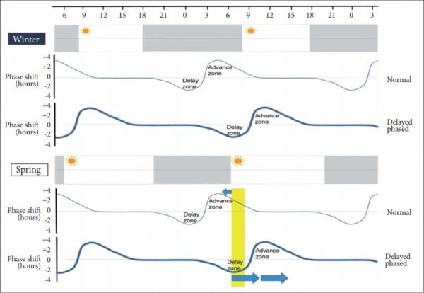 一般健康人的昼夜节律,会随着日照时长的变化有适应性调整。但对于抑郁、躁狂和双相患者而言,他们的昼夜节律会比大多数人延迟 4 到 6 小时。这可能意味着,大多数人即将醒来的时候患者们才刚刚准备入睡,而光照时间的提前会进一步延迟其昼夜节律,昼夜节律的延迟有可能诱发情绪不稳定甚至躁狂。