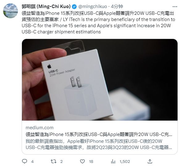 郭明錤:领益智造为iPhone 15系列改采USB-C与Apple显著调升20W USB-C充电出货预估的主要赢家