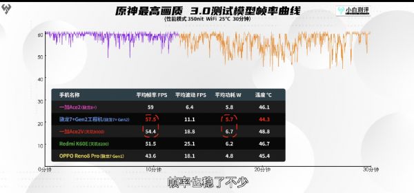 跑分只能代表理论数据,实际测试结果怎么样呢?骁龙7+在《原神》最高画质下跑出57.5帧成绩,这已经极为接近骁龙8+处理器表现,而且还小幅领先天玑9000机型,机身温度只有44.3度为所有测试机型中最低,加上液冷散热表现还会更强劲,未来中端机要征服《原神》不是梦。