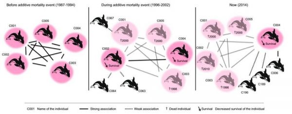 非法捕鱼期间,随着大量个体的死亡,这一虎鲸社群的里的社会联系(association)的强度和数量都明显下降了。集中死亡事件结束后,2003年~2014年,虽然社会联系的数量恢复到事前的水平,但强度依然很低。