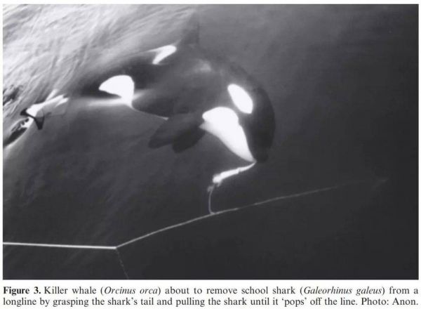 一头虎鲸咬住延绳钓上的翅鲨 | aquaticmammalsjournal