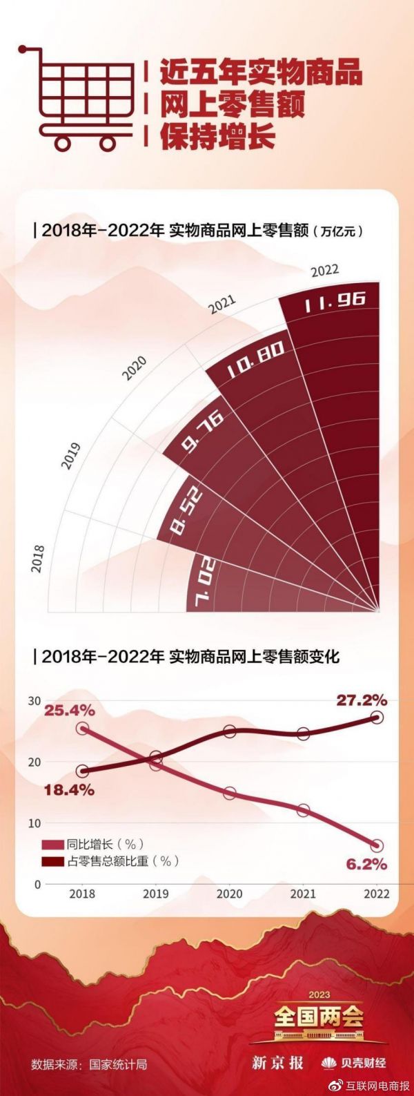 据商务部发布统计数据显示,去年网络零售发力稳住了消费,占社会消费品零售总额比重上升。其中实物商品网上零售额达11.96万亿元,同比2021年增长6.2%,占社会消费品零售总额比重从2018年的18.4%增至27.2%。