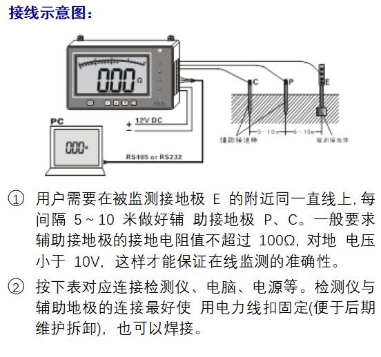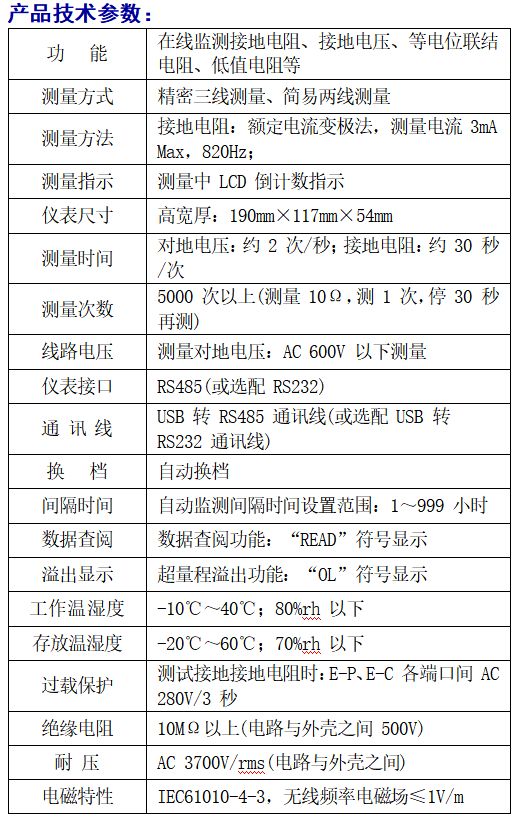 由检测仪、监控软件等组成,检测仪超大 LCD显示,非常直观;可以通过其按键设置报警临界值,具有声光报警指示;外壳材料有耐高低温、防腐、阻燃等特性,确保野外、矿井下、室内等长时间在线监测的高精度、高稳定性、高可靠性。监控软件可以实时显示被测接地电阻、接地电压的值其自动记录存储的数据可以生成报表,方便保存、历史数据查询、打印、分析等。