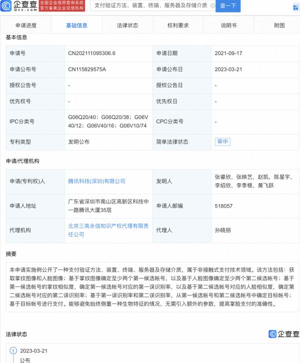 企查查APP显示,近日,腾讯科技(深圳)有限公司“支付验证方法、装置、终端、服务器及存储介质”专利公布。企查查专利摘要显示,本申请属于非接触式支付技术领域。方法包括:基于获取的掌纹图像和人脸分别确定至少两个第一、第二候选帐号,基于第一候选帐号的掌纹相似度确定对应的第一误识别率,以及基于第二候选帐号对应的人脸相似度确定对应的第二误识别率;基于第一误识别率和第二误识别率确定目标帐号;基于目标帐号进行支付。本申请能够避免始终侧重一种生物特征的情况,无需引入额外的参数,提高掌脸支付的准确性。