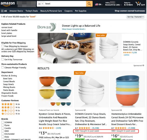 图源:Amazon搜索页面亚马逊官方并没有公布这一功能的推出,目前来看,这一新功能正处于内测阶段。在服装、玩具、家居、家具等类目搜索页面中,部分产品已显示销量数据。不同用户搜索,展示页面的时间不同,体现了亚马逊的千人千面。有的人看到的是Past week,有的是Past month。同时,产品销量数据不会精确到个位数,通常只会显示“500+”、“300+”等大致数据。