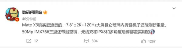 本次的Mate X3主打轻薄,配置上博主数码闲聊站带来了多方面的爆料,其表示本次的Mate X3确实很轻便,同期竞品是vivo的X Fold2,该机正面为一块7.8英寸的2K分辨率120Hz大屏,且搭载了华为自主打造的昆仑玻璃,也是首款昆仑玻璃的折叠屏手机。