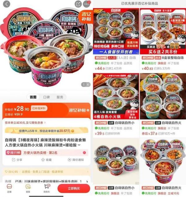以食品品牌自嗨锅为例。在京东百亿补贴中,自嗨锅只有一款“麻辣烫+酸辣粉+牛肉粉”的组合产品参与补贴,但在拼多多上,自嗨锅品牌官方旗舰店+专卖店至少30种产品组合参与了百亿补贴活动。