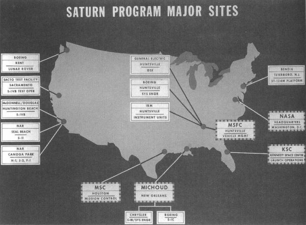 位于亨茨维尔…这里也热闹了…聚集了通用电气、波音、IBM、马歇尔太空飞行中心(MSFC)一大票大佬,分别负责地面支持设备(Ground Supporting Experiment,GSE)、系统工程建设(System Engineering,SYS ENGR)、仪器单元以及航天器管理(Vehicle Management,Vehicle MGMT)。