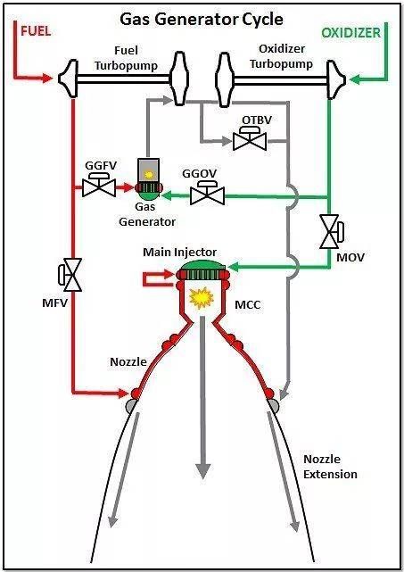 上图中可以看到,在燃料与氧化剂的进入管路中分别有两个涡轮(分别是燃料涡轮泵Fuel Turbo-pump与氧化剂涡轮泵Oxidizer Turbopump),带动它们运行的则是中间的涡轮。考虑到火箭最不缺的就是燃料,因此利用一部分燃料导入到燃气发生器(Gas generator)中形成燃气,就能带动中间的涡轮运行起来,继而带动燃料与氧化剂泵加压。而燃气发生器产生的废气则可以导出至喷管(Nozzle)外围点燃,也可以直接排放。