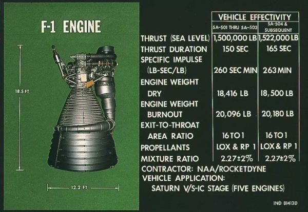 这台发动机全高约5.6米,全宽约3.7米,海平面推力为680吨,工作时间约为165秒,最低比冲263秒,引擎干重8.4吨,喷喉扩张比16:1(即喷管面积是喉部收敛段面积的16倍),燃料混合比2.27(质量比)……总之,是发动机中的豪杰。