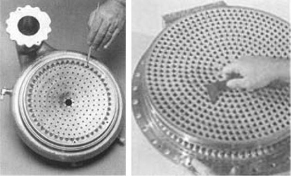 喷注器位于燃烧室上部,下面是极高温高压的、正在燃烧的混合燃气,上面则是源源不断输入的燃料与氧化剂。为了保证燃料能够均匀、充分地混合,在这么个分界面上需要密密麻麻打上数千个孔——土星五号需要3700个燃料喷嘴用来喷射煤油,再用2600个燃料喷嘴用来喷射氧化剂,而这么个喷注器内部还有32个辐射状管路用来输送煤油。