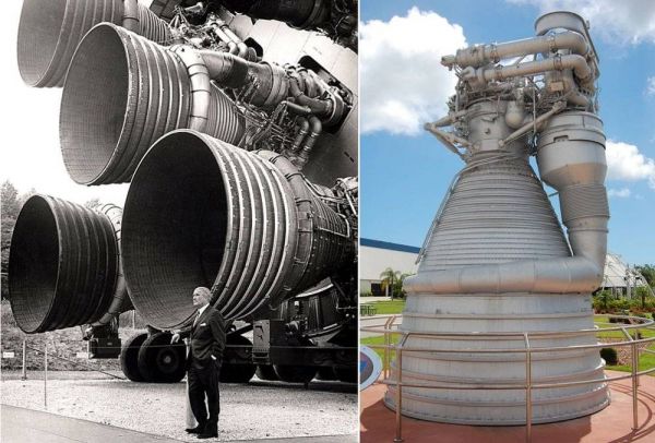仅仅是F-1发动机就有这么大!(左)土星五号的F1发动机与火箭之父冯·布劳恩合照。来源:NASA;(右)肯尼迪空间中心对游人展出的单个F1发动机。来源:维基/Jud McCranie