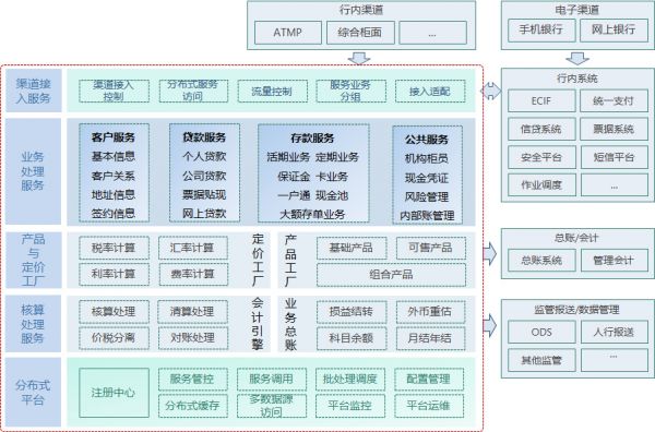 整体功能定位以客户为中心,通过参数工厂、产品工厂、定价工厂等进行组装为客户提供存款、贷款、借记卡、同业、内部账等业务的金融产品及服务,围绕账户可对外提供支付结算、中间业务、国际结算等方面的服务支持。同时,核心业务系统还提供了银行的公共管理方面的功能,包含运营管理(机构、柜员、现金、凭证等)、风险管理(黑名单、交易限额、授权等)。最后系统通过会计引擎实现交易与核算分离,可以实现准实时价税分离,实现产品多维度总账管理功能,基于业务总账实现汇兑损益重估、准备金计提、外币重估、年终结转等围绕总账的业务功能处理,能够实现全行级会计引擎,实现全行账务接入、账务平衡、总分平衡等账务一致性检查处理。