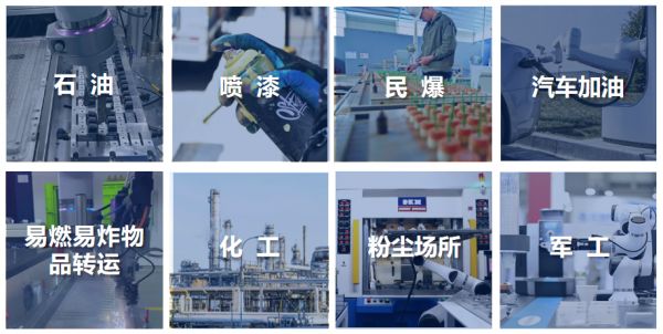 可以满足石油石化(石油冶炼、危险气体转运、环境巡查)、喷漆(金属及塑胶制品表面喷漆喷粉)、服务(如汽车自动加油、加气等)等行业的需求,同时适用于扬尘较多、液体飞溅明显的场景。
