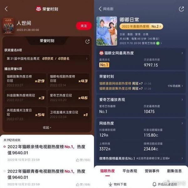 图/阅文出品剧集《人世间》和《卿卿日常》的热度数据
