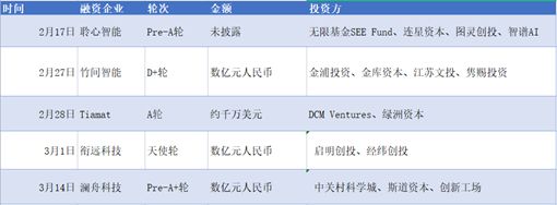 致力于对话机器人行业解决方案的竹间智能完成超亿元D+轮融资;致力于企业创新数智化平台的衔远科技完成数亿元天使轮融资;医疗交互AI平台聆心智能完成Pre-A轮融资;二月底,Tiamat完成近千万美元A轮融资, DCM和绿洲资本联合领投。