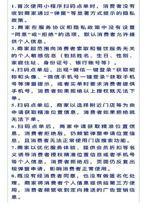 针对以上问题,上海市网信办会同市市场监督管理局、市消保委依法对相关餐饮企业开展联合约谈,责令限期整改,并开展普法教育。同时,上海市网信办也在开展科普——当餐饮企业存在以下行为将涉嫌违法违规收集使用个人信息: