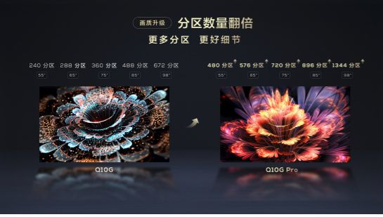 在Q10G的基础上,TCL进行了五大维度的全面升级。首先是画质升级,通过全新一代Mini LED背光技术,TCL Q10G Pro实现分区数量成倍提升,98/85/75/65/55吋的分区数分别为1344/896/720/576/480,均超过三百级,最高突破上千级,控光精细程度提升100%,可减少光晕,画面细腻自然,并且可精确调节亮度,从而展现更具层次万象分明的精彩画面。