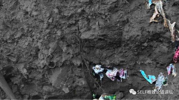 这是我在北京奥林匹克公园拍到的一张照片,几个建筑工人在挖土准备维修地下管道,令人震惊的是,这个土的侧表面布满了垃圾袋。
