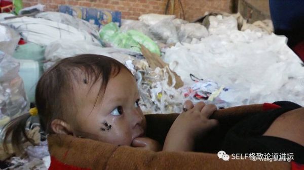 这是一个妈妈正在处理垃圾,她背上的孩子和她一起生活在垃圾堆里。
