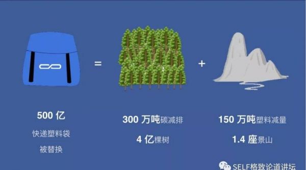 假设人人都参与进来,我们一年制造的 500 亿个的快递塑料袋都被循环袋替换,就相当于一年种了 4 亿棵树,一年减少 150 万吨塑料,相当于阻止了 1.4 座景山那么多的快递塑料袋垃圾。