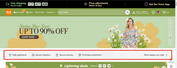 支付安全、安全保护被放在Temu网站首页,图片来源:Temu