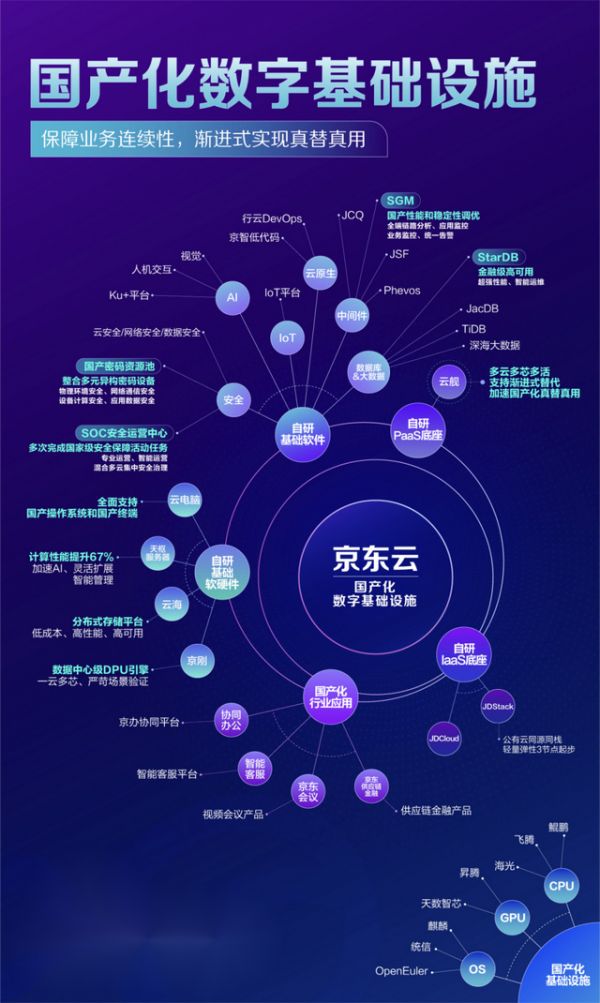 京东各个业务板块的上百个业务应用,很早就有意识地进行国产化替代。这个过程中,京东云相继打造了云操作系统云舰、软硬一体虚拟化引擎京刚、存算分离 分布式存储平台云海、国产分布式数据库、SGM全链路服务监控等产品和服务。目前,京东80%的应用支持在国产化基础设施上稳定运行,实现了产业级的真替真用。