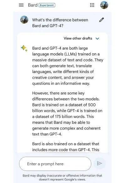 拿到内测资格之后,硅星人今天也第一时间对Bard进行了测试。当被问及认为自己跟GPT-4有什么区别时,Bard显现出了相当的自信,Bard表示虽然自己跟GPT-4都是大型语言模型,但自己使用了5000亿参数进行训练,但GPT-4只有1750亿参数,所以自己能比GPT-4产出更复杂、更具相关性的内容。
