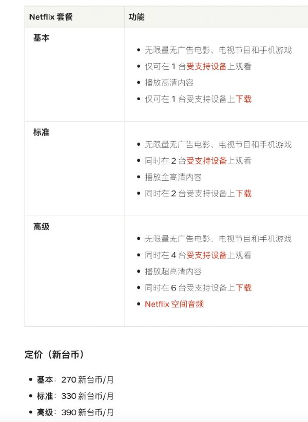 而且,网飞高级会员账号可以同时在四台设备上使用,标准会员则减少到两台,基本会员只能在一台设备上用。价格方面,三类会员当然也有明显的区别,以中国台湾地区的定价为例,基本会员月费大概是60元人民币,标准会员为74元,高级会员为88元。