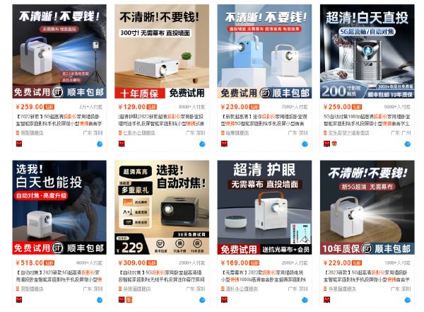 在这种趋势的转变下,很多人也盯上了便携式投影市场,准备将投影从家里带到室外。于是,前几年开始市面上就陆续涌现出大量所谓的户外投影仪、便携投影仪、迷你投影仪产品,除了产品体积小巧外,价格也相当便宜。在电商平台上随便一搜“便携投影仪”,能看到大量价格在500元以内的产品。其中很多还打出白天也能投、超清、无需幕布的标语,虽然小雷从未买过这类产品,但无需体验也能大概猜出其投影画质,顶多就是“能看”的水准。