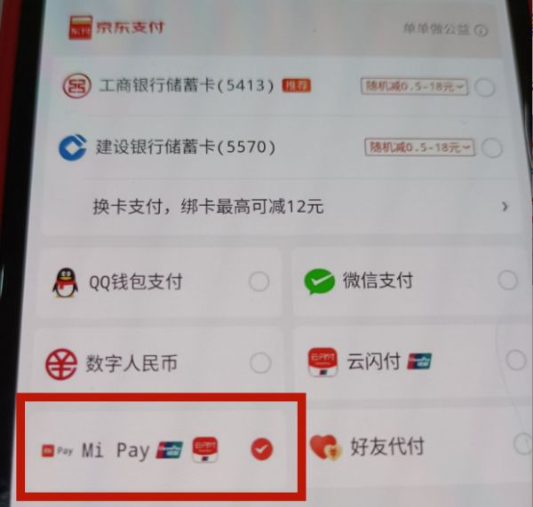 IT之家 3 月 22 日消息,京东闪付此前支持 Apple Pay、Huawei Pay、Samsung Pay,据IT之家网友投稿,京东的商品支付页面中出现了 Mi Pay。
