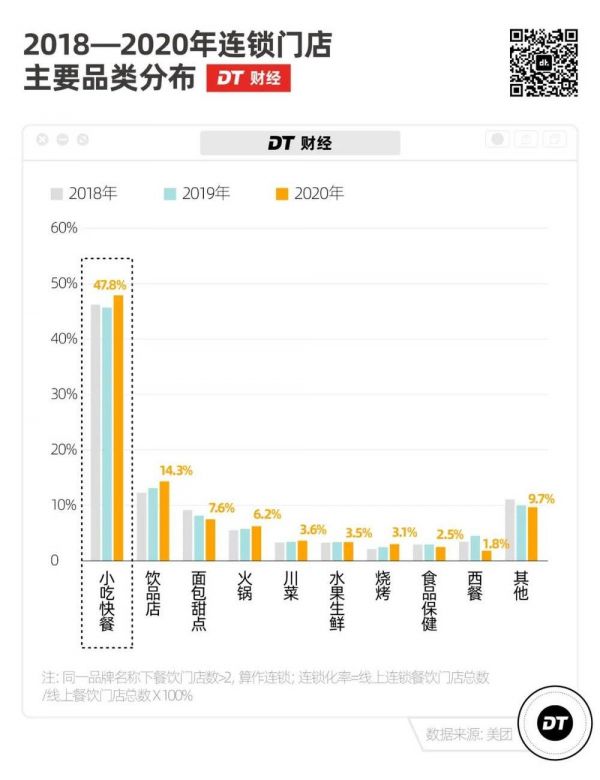 美团数据显示,在快餐小吃品类上,餐饮连锁化是大势所趋。