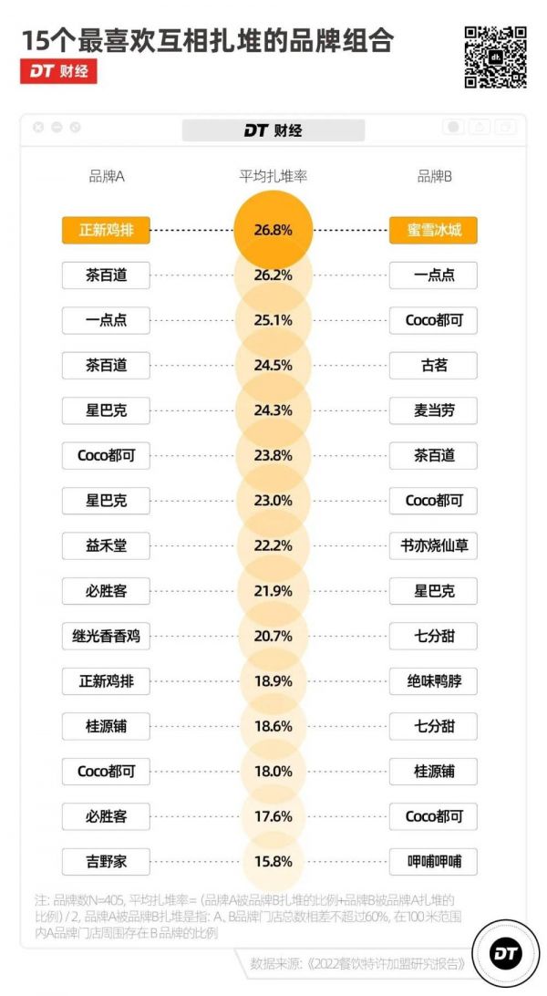 他进一步研究了喜欢“互相扎堆”的品牌,计算它们的平均扎堆率,正新鸡排和蜜雪冰城仍然名列第一。