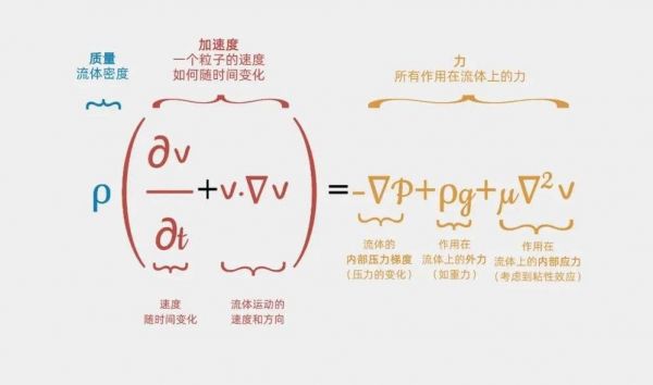 纳维-斯托克斯方程。它是一组非线性偏微分方程,描述了黏性、不可压缩的流体,在给定的黏度、集体速度和外部压强下如何运动。它可以被简单理解为牛顿第二定律的流体版本,只是牛顿第二定律连接的是加速度与作用力,而纳维-斯托克斯方程则将流体速度的变化率与作用于流体上的力联系了起来。(图/原理)