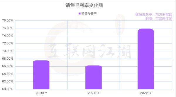 我们从财报中也能看出一些相应的变化。比如2022年销售毛利率比2021年高出了大约10%左右,2022年销售毛利率75.9%,2021年则为66.2%。