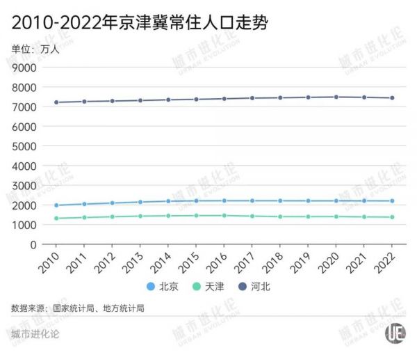具体来看,北京已连续六年常住人口“温和”负增长,2022年人口减少最多,为4.3万人;天津则连续两年净减少人口规模在10万水平;最大的变化发生在河北身上,继2021年减少15.84万人后,2022年流失规模接近翻倍,达到28万人。