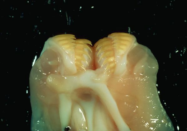 这个名字更适用于七鳃鳗,它们拥有圆盘状的吸盘口,口中有许多牙齿,使它们能够附着在鱼身上,从鱼身侧面撕扯鱼肉。此前,一项惊人的发现证实了圆口纲动物的独特演化历程[1]。该研究首次发现了一具盲鳗化石,它来自1亿年前,连同黏液痕迹都保存完好,就像是“石头里的一个喷嚏”。它突显了这种生物与七鳃鳗之间的密切关系,并证明它们并不如部分科学家此前推测的那样,是我们脊椎动物的原始祖先。