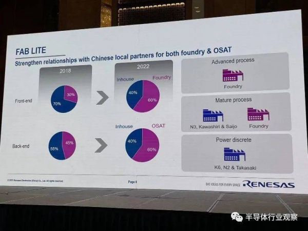 近日,瑞萨电子在媒体沟通会上强调了其一直坚持的Fablite策略,增加了前端和后端流程的外包占比。截至2022年,瑞萨电子自产比例不到一半,前后端工艺均为40%。
