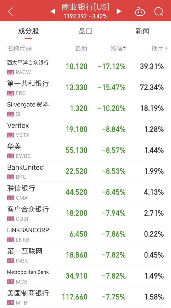 标普500指数的11个板块全军覆没,银行业更是普遍下跌,正陷于困境的美国第一共和银行收跌超15%,西太平洋合众银行跌超17%,拖累刚有所起色的区域银行ETF大跌5.69%,银行业ETF也大跌5.16%。