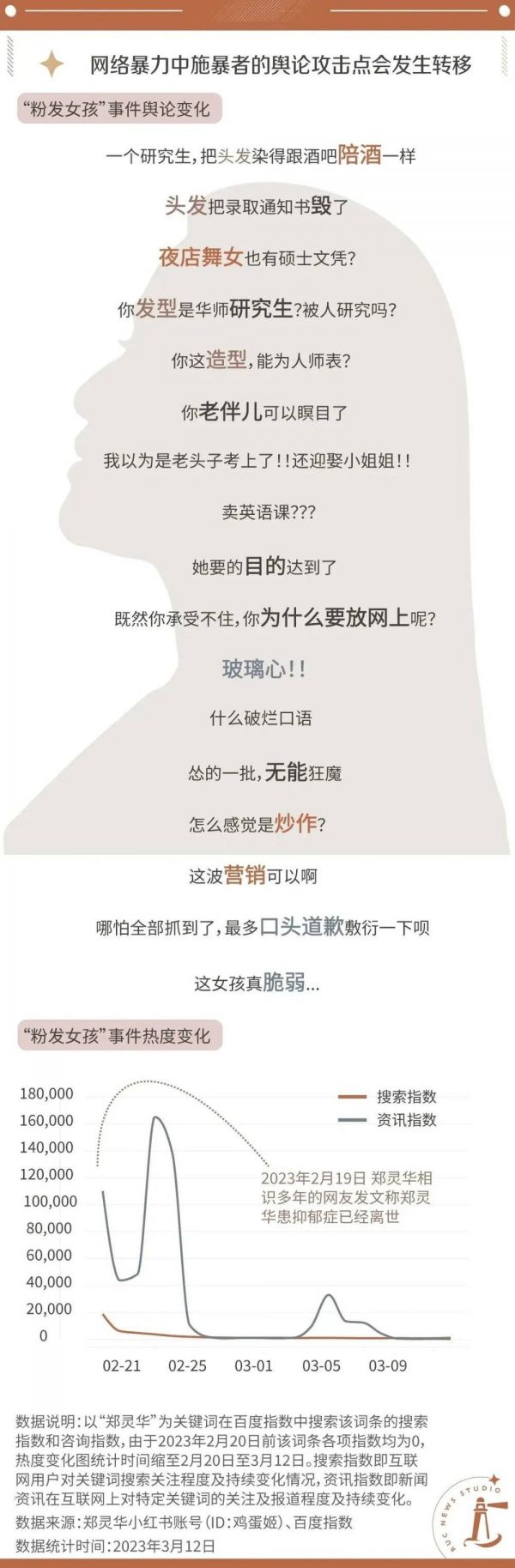 这些刺耳的声音,是因“粉色头发”而被网暴的女孩郑灵华生前所经历的。从开始遭受谣言和辱骂到离开人世,195天里,郑灵华一条一条回复那些对她的恶评:“您好,我是当事人郑灵华,请问您认为是什么目的,请直接和我对话。”“您好,我是当事人郑灵华,如果你认为我不是好女孩,请直接和我对话。”