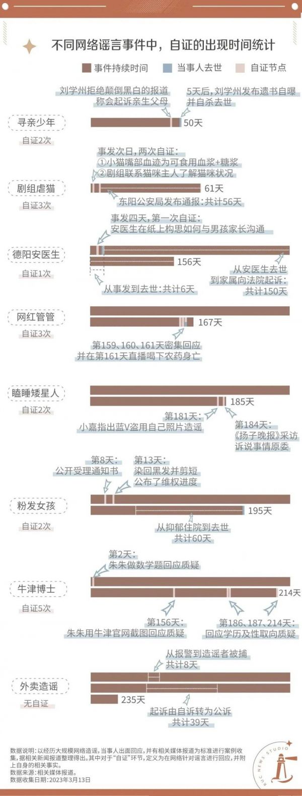 董晨宇强调,当下进行互联网自证,难度主要体现在两个方面:一是面对无数想象的受众,受害者需要澄清的指责并非是单一的。回顾部分网暴、造谣事件的时间线,多数受害人都针对不同的虚假信息与尖锐质疑,进行了超过一次的自证。如牛津女博士生朱朱在两百余天的时间内,被依次指控“数学不行”“学历造假”“装姬”,面对这些虚假事实和攻击,她进行了总计五次的自证。
