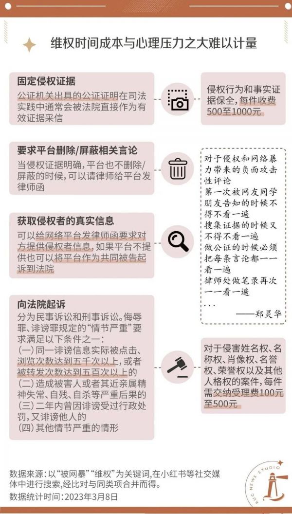 然而,当网暴者决定诉诸法律之时,他们所面临的不仅仅是胜诉的困难,还有在漫漫维权长路上的时间成本与一次次收集网暴证据带来的心理压力。维权是一件长期的、反复的工作,散落在一件件琐事上:取证与固定证据、要求平台删除与屏蔽相关言论、获取侵权者的真实信息、向法院起诉。