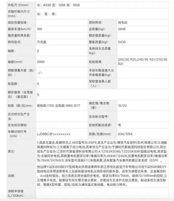 第三款车已经有了眉目。财经汽车在工信部2月公布的第368批新车申报目录发现,高合申报了一款中型SUV,车身长宽高分别为4938/1958/1658mm,轴距为2950mm。申报信息显示,该车型将提供四驱和后驱两个版本。