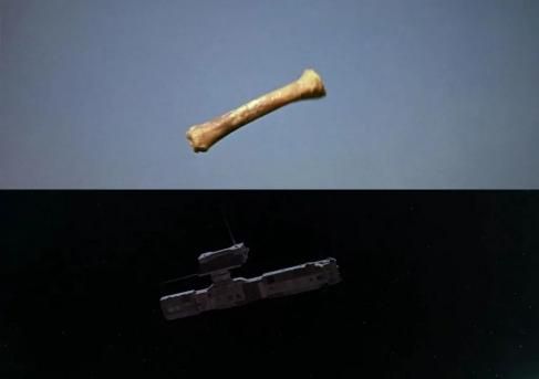 开头两分钟的镜头展示了人类祖先的生活面貌,猿人第一次了解到骨头如何作为工具使用,开启了智性。当白色的兽骨扔到空中时,瞬间切成了遨游在太空里的孤寂的宇宙飞船。