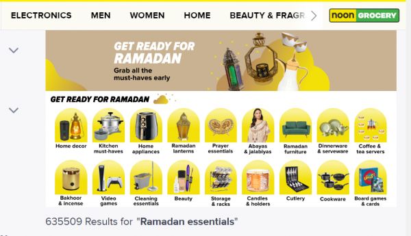 霞光社浏览中东电商平台Noon时发现,首页显眼位置已专门标注出“斋月商店”的专门入口,宣传语则是“为圣月采购生活必需品”。相关商品则覆盖了从家居厨房、工具装饰、美容健康,到玩具游戏、电子产品等多个品类。仅Noon平台上“斋月生活必需品”下的搜索结果就有超过60万条。