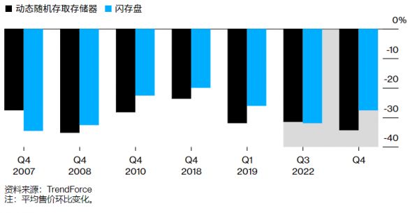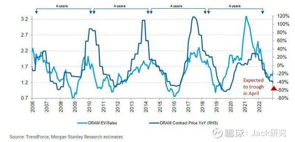 从TrendForce的数据来看,DRAM基本遵循了4年一个周期的特征。2022年的“同款暴跌”分别在2012年、2016年、2020年左右出现。此前价格触底时,都同比下跌超过40%,目前的下跌幅度已经接近于往年纪录。